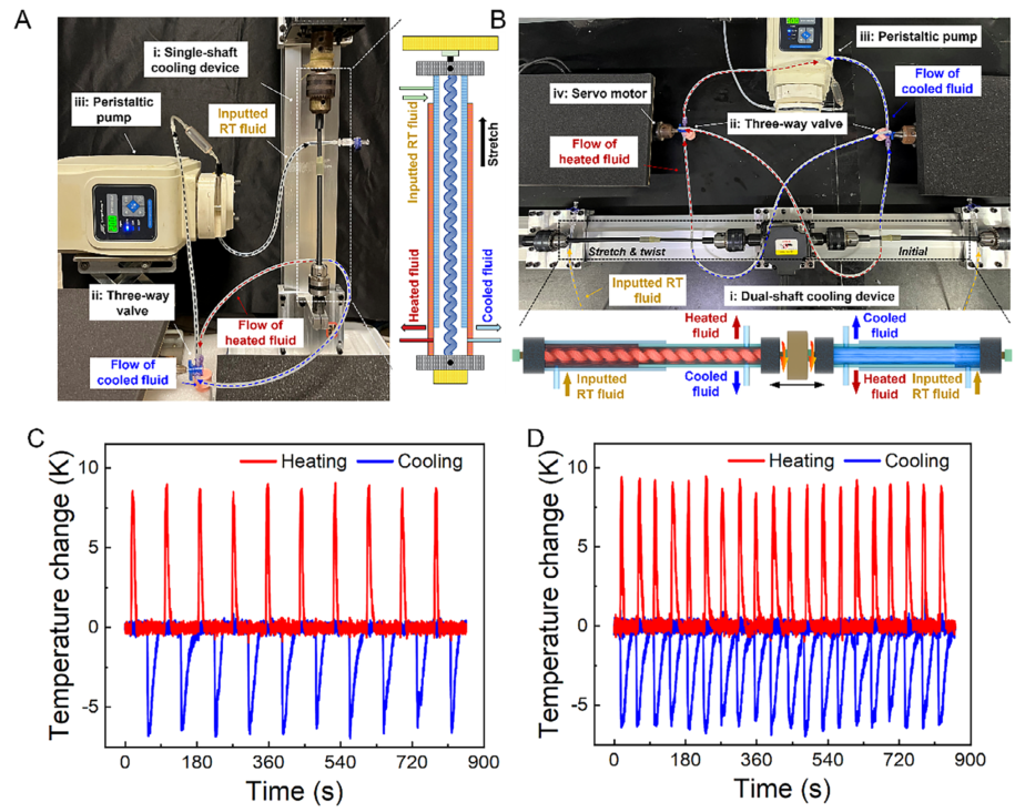 图6: 基于PpPU₂₀₀₀纱线的扭热制冷装置构建。(A) 结合纱线加捻和拉伸的扭热制冷装置照片和示意图。(B) 两个异相运行的扭热制冷装置照片和示意图,结合了纱线加捻和拉伸。(C) 结合纱线加捻和拉伸的(A)装置出口流体温度变化。(D) 结合纱线加捻和拉伸的(B)装置出口流体温度变化。这些装置中的纱线由80股初始直径230 μm、初始长度12.5 cm的PpPU₂₀₀₀纤维组成,初始加捻密度为10.0 turns cm⁻¹,初始应变为60%。用于热提取和冷提取的流体为乙二醇。
