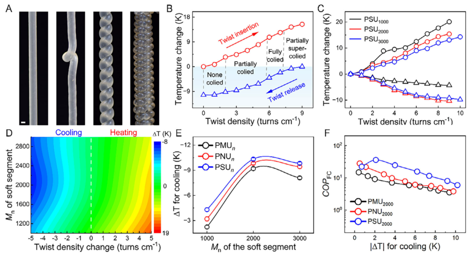 图2: 具有不同氢键密度和不同软段长度的聚缩二脲纤维的扭热制冷性能。(A) 直径2.0 mm的PSU₂₀₀₀纤维在50%拉伸应变下,在3.0 turns cm⁻¹加捻密度下开始卷曲、8.0 turns cm⁻¹完全卷曲、13.0 turns cm⁻¹完全超卷曲的光学照片。这些PSU₂₀₀₀纤维通过熔融纺丝制备。比例尺代表1 mm。(B) 含有100股230 μm直径纤维的PSU₂₀₀₀纱线在50%等长应变下加捻和解捻过程中的温度变化。图中标注了实现非卷曲、部分卷曲、完全卷曲和部分超卷曲结构的加捻密度。(C) PSU₁₀₀₀、PSU₂₀₀₀和PSU₃₀₀₀纱线在加捻和解捻过程中的温度变化。(D) PNU₂₀₀₀纱线在加捻和解捻过程中红外相机测量的温度变化等高线图。(E) PSUₙ、PNUₙ和PMUₙ纱线(n=1000、2000和3000)释放8.0-10.0 turns cm⁻¹加捻后获得的制冷温度。(F) PSU₂₀₀₀、PNU₂₀₀₀和PMU₂₀₀₀纱线释放1.0-9.0 turns cm⁻¹加捻后获得的制冷系数(COPFC)随制冷温度的变化。