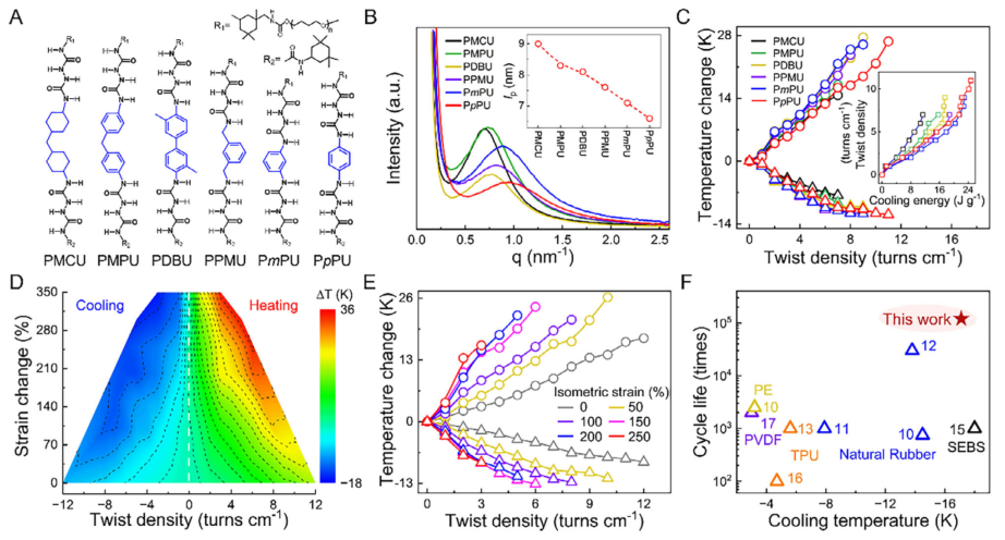 图5: 具有不同硬段间隔基团的聚脲纤维的扭热制冷性能。(A) 具有不同间隔基团的聚脲纤维硬段的分子结构。(B) SAXS散射强度随硬段间距离倒数(q)的变化。插图显示不同组分的硬段间周期距离(lp)。(C) 具有不同硬段间隔基团的聚脲纤维在加捻和解捻过程中表面红外测量的升温和降温温度随加捻密度的变化。插图显示单位纱线质量的制冷能量。(D) PpPU₂₀₀₀纤维在不同应变下表面红外测量的制冷温度随加捻密度的变化;在制冷过程中,先移除加捻,然后移除拉伸。(E) PpPU₂₀₀₀纤维在不同等长拉伸应变下加捻和解捻过程中表面红外测量的升温和降温温度随加捻密度的变化。(F) 本工作中PpPU₂₀₀₀纤维的循环寿命和扭热制冷温度与文献报道的机械致热聚合物制冷材料的比较。(F)中数据点旁边的数字代表相应参考文献的编号。