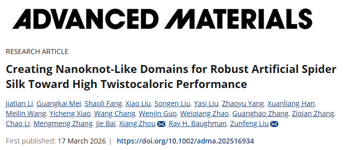 近日,南开大学化学学院、有机新物质创造前沿科学中心刘遵峰教授与中国药科大学药学院周湘副教授合作,受蜘蛛丝多级结构的启发,成功合成了一种新型聚脲弹性体纤维。该材料通过独特的纳米结状结构域设计,实现了高达316.5兆帕的断裂强度、523.4兆焦每立方米的韧性,以及17.1开尔文的最大降温幅度,卡诺效率达到89.7%,机械疲劳寿命超过12万次,为高性能聚合物制冷材料的设计提供了全新策略。相关论文以“Creating Nanoknot-Like Domains for Robust Artificial Spider Silk Toward High Twistocaloric Performance”为题,发表在Advanced Materials上,南开大学有机新物质创造前沿科学中心为论文通讯单位。