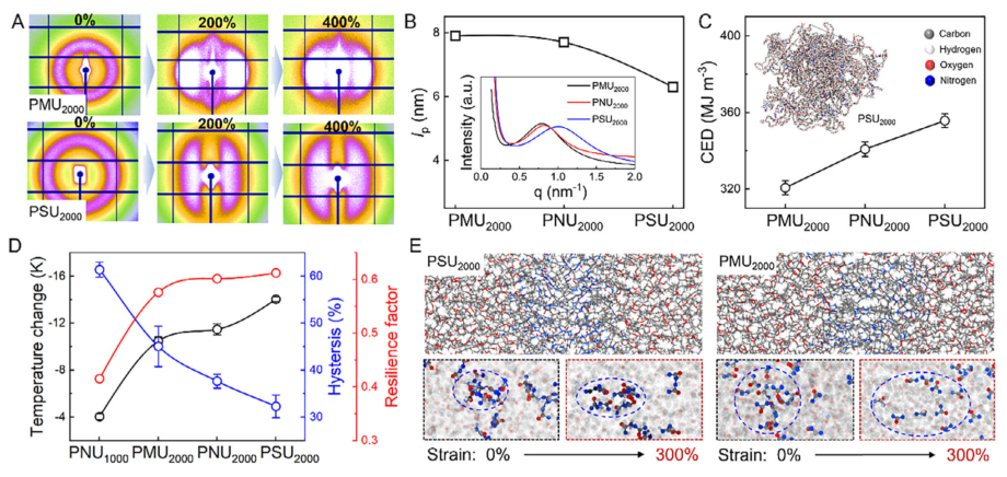 为了揭示材料结构与性能的构效关系,研究团队运用小角X射线散射、原子力显微镜和分子动力学模拟等手段对纳米结状结构域进行了深入表征。小角X射线散射结果显示,PSU2000在拉伸过程中保持单一散射峰,硬段间平均距离为6.3纳米,而PNU2000和PMU2000则出现两个散射峰,表明更高的氢键密度有助于形成更稳定的自组装结构(图3A-B)。全原子分子动力学模拟表明,PSU2000具有更高的内聚能密度,形成更密集的氢键网络(图3C)。综合比较显示,PSU2000在降温幅度、能量损耗百分比和回弹因子等方面均优于其他材料(图3D)。分子模拟快照直观呈现了PSU2000和PMU2000在拉伸300%前后的结构演变,PSU2000中双脲基团在高应变下虽发生局部氢键解离,但硬段结构域的纳米结整体稳定性得以保持,而PMU2000中的脲基团则在拉伸过程中逐渐断裂分散(图3E)。