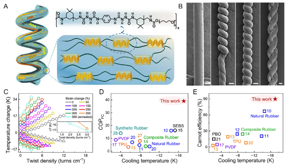 随着全球约20%的电力消耗用于制冷需求,传统蒸汽压缩制冷技术不仅能耗巨大,还释放对环境有害的气体。面对这一挑战,固态制冷技术因其高能效和无排放特性而备受关注,其中弹热制冷技术展现出巨大潜力。然而,如何在聚合物基扭转热效应材料中同时实现高制冷效率与长循环寿命,一直是困扰科学界的难题。