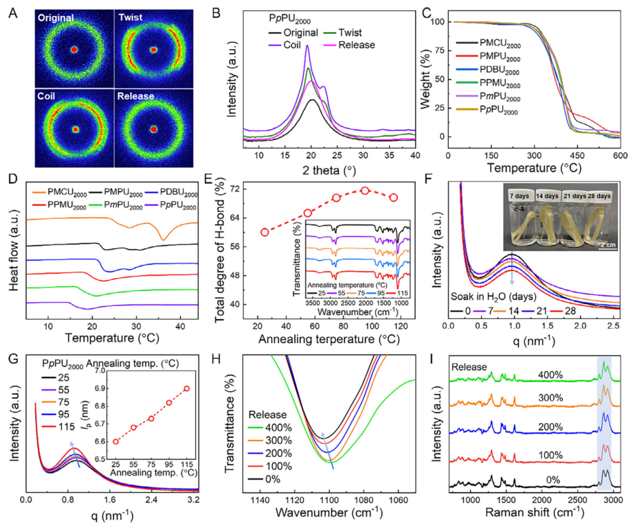 图4: 聚缩二脲纤维的结构演变与热性能。(A) PpPU₂₀₀₀纤维在初始态、加捻态和螺旋卷曲态的二维广角X射线散射(2D-WAXS)图案。(B) 对应(A)中WAXS图案的一维强度分布曲线。(C) PMCU₂₀₀₀、PMPU₂₀₀₀、PDBU₂₀₀₀、PPMU₂₀₀₀、PmPU₂₀₀₀和PpPU₂₀₀₀纤维的热重分析(TGA)曲线。(D) 对应(C)中纤维的差示扫描量热(DSC)曲线,显示软段熔融温度。(E) PpPU₂₀₀₀纤维在不同温度退火后的氢键分数。(F) PpPU₂₀₀₀纤维在水中浸泡不同时间后的SAXS曲线。(G) PpPU₂₀₀₀纤维在不同温度退火后的SAXS曲线。(H) PpPU₂₀₀₀纤维在拉伸-回复循环中原位FTIR光谱的1100 cm⁻¹波段变化。(I) PpPU₂₀₀₀纤维在拉伸-回复循环中原位拉曼光谱的2863 cm⁻¹和2920 cm⁻¹波段强度比变化。