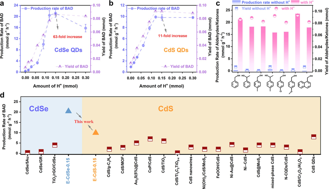 图3. E-CdSe-X (0 ≤ X ≤ 0.30) 催化芳香醇光催化氧化的结果。(a,b) 对于(a) CdSe QDs和(b) CdS QDs,苯甲醛生产速率和产率随X的变化图;(c) E-CdSe-0.15催化多种芳香醇生成醛/酮的产率及生产速率;(d) 在可见光下,通过各种CdSe和CdS相关光催化剂催化BAD生产速率的比较。