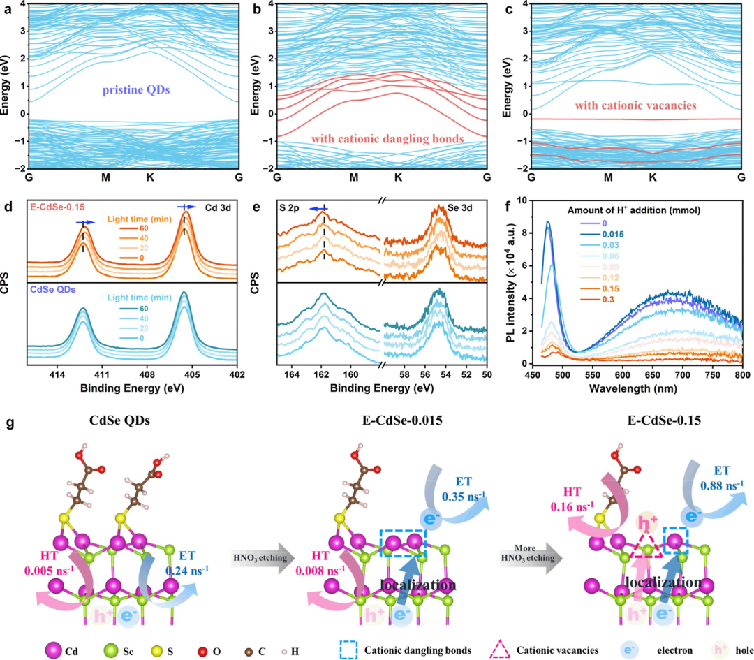 图2. 光生电子和空穴的同时局域及其对光生载流子动力学的影响。(a-c) (a) 原始CdSe QDs的(111)表面、(b) 具有阳离子悬挂键的表面或(c) 具有阳离子空位表面的能带结构;(d,e) 在光照下CdSe QDs和E-CdSe-0.15的(d) Cd 3d、(e) S 2p和Se 3d的原位XPS谱图;(f) 经不同量H⁺处理的CdSe QDs的光致发光光谱;(g) 载流子局域动力学示意图。