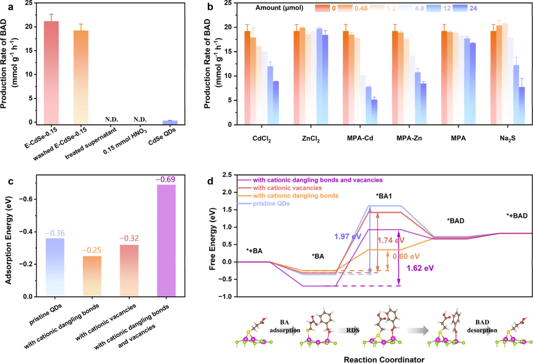 图5. (a) E-CdSe-0.15、洗涤后的E-CdSe-0.15、洗涤后E-CdSe-0.15的上清液、原始CdSe QDs和0.15 mmol HNO₃催化BAD生产速率的比较;(b) 洗涤后的E-CdSe-0.15添加不同缺陷修复试剂后催化的BAD生产速率;(c) BA在CdSe QDs (111)晶面上的吸附能和(d) BA氧化为BAD各反应阶段计算得到的吉布斯自由能(插图显示了双缺陷(111)表面上的反应步骤)。
