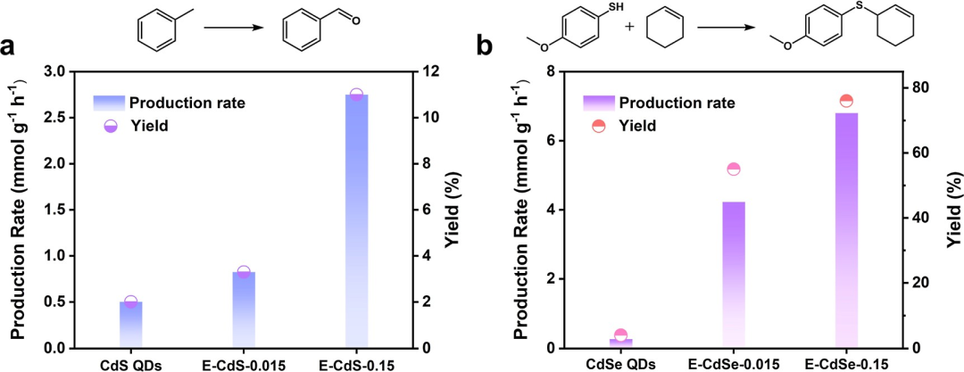 图4. 甲苯氧化和烯丙基C(sp³)-H硫醇化的光催化结果;(a) CdS QDs、E-CdS-0.015和E-CdS-0.15光催化氧化甲苯生成BAD的反应;(b) CdSe QDs、E-CdSe-0.015和E-CdSe-0.15光催化烯丙基C(sp³)-H硫醇化的反应。