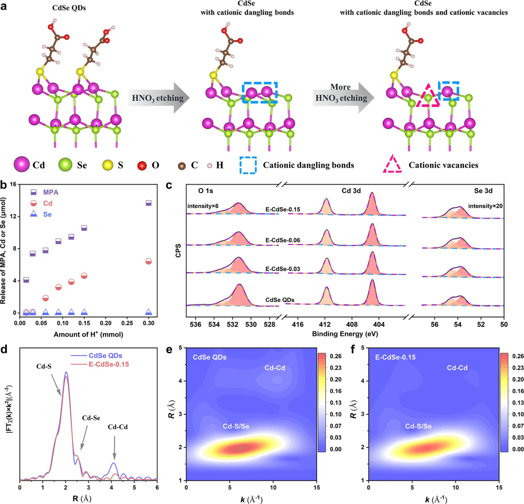 图1. CdSe QDs酸刻蚀过程的设计与分析及由此产生的变化:(a) 通过简单酸刻蚀在CdSe QDs上产生阳离子悬挂键和空位的示意图;(b) CdSe QDs上清液中MPA、Cd和Se的H⁺依赖性浸出量;(c) 经不同量H⁺处理的CdSe QDs的O 1s、Cd 3d和Se 3d的X射线光电子能谱图;(d) CdSe QDs和E-CdSe-0.15在k²加权R空间的Cd K-edge X射线吸收精细结构谱的傅里叶变换图;(e,f) (e) CdSe QDs和(f) E-CdSe-0.15的k²加权EXAFS信号的小波变换图。