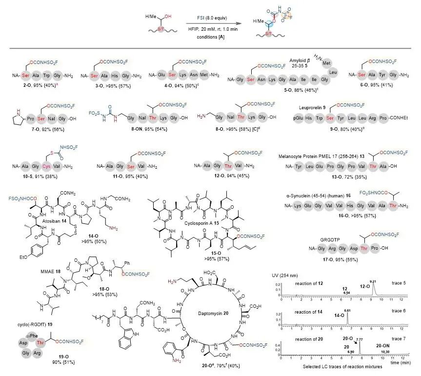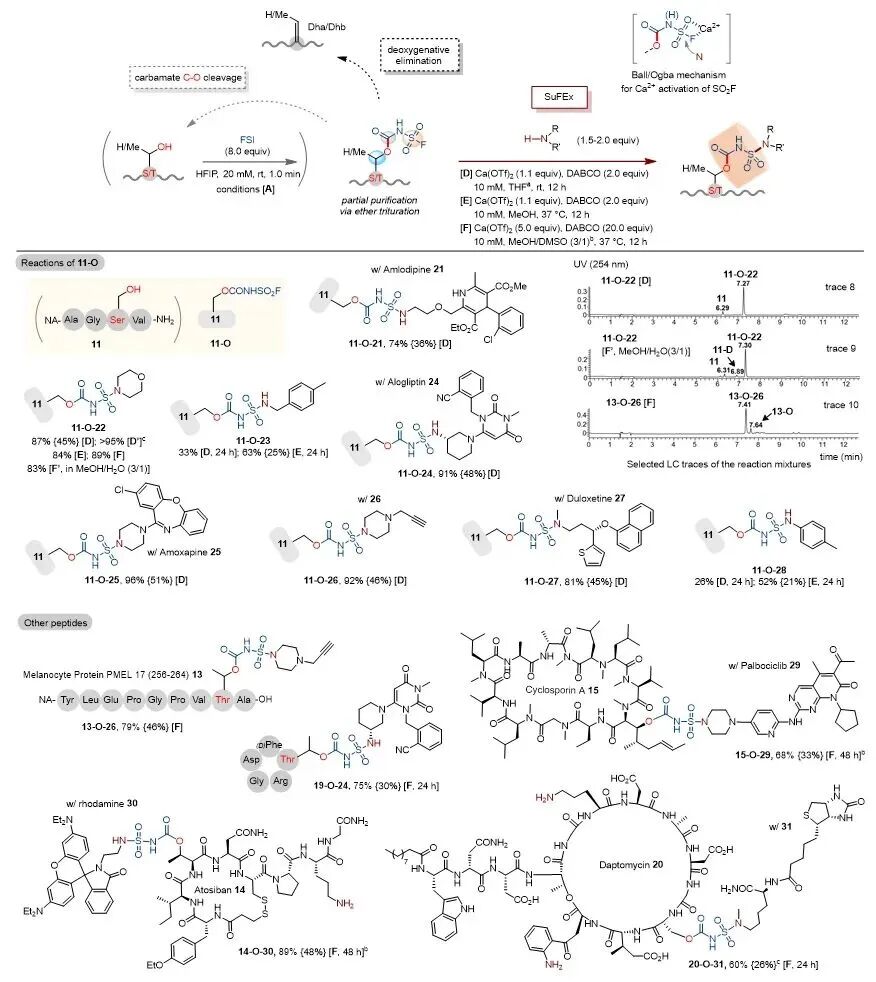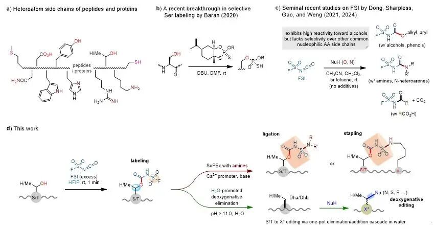 近日,针对这一瓶颈,南开大学化学学院、有机新物质创造前沿科学中心陈弓教授团队结合FSI反应特性、异氰酸酯-醇缩合反应机理,并基于前期课题组在溶剂调控多肽侧链反应性方面的研究基础,发现以六氟异丙醇(HFIP)为反应溶剂,可精准调控FSI的反应活性,在室温条件下1分钟内即可完成多肽、蛋白质中Ser/Thr侧链羟基的快速、高选择性标记。经FSI标记的多肽既能与多种胺类化合物发生分子间SuFEx取代反应,生成磺酰胺偶联产物;也可与赖氨酸侧链发生分子内大环化反应,通过Ser/Thr-Lys位点构建订书肽。值得注意的是,修饰在Ser/Thr上的氟磺酰氨基甲酸酯标签可在碱性水相中简便脱除,生成脱氢氨基酸残基;该中间体可进一步与硫醇、胺、膦等亲核试剂发生一锅Michael加成,以脱氧修饰的方式将多肽的醇羟基侧链转化为杂原子连接型衍生物。