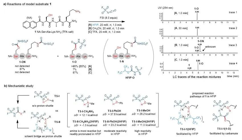 此前,董家佳与Sharpless的研究发现,氟磺酰异氰酸酯(FSI,图1c)在乙腈、二氯甲烷等有机溶剂中可与多种醇快速反应,但该反应体系缺乏化学选择性,FSI易与胺、氮杂芳烃、酚类及羧酸发生副反应,无法应用于复杂多肽的羟基特异性修饰。