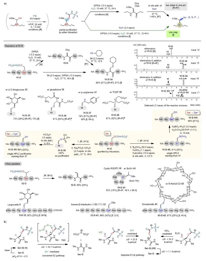 该团队在考察11-O稳定性及与胺的SuFEx反应时,意外发现碱性水环境下会生成烯烃消除产物11-D。后续研究证实,丝氨酸衍生的氟磺酰氨基甲酸酯在温和碱性水溶液中可高效发生烯烃消除(图6a)。研究结果表明,小体积、强碱性的氢氧根离子可高效攫取氨基甲酸酯修饰的Ser/Thr残基α-质子,触发消除形成烯烃;而大位阻有机碱(如DIPEA、NEt₃)攫取α-质子效率偏低,在大分子量多肽底物中尤为显著。结合实验与DFT计算结果(图6b),该消除过程更倾向于遵循OH⁻介导、水辅助的协同E2机理,反应能垒较低(ΔG⧧=24.7 kcal/mol);但由于直接去质子化步骤的能垒与之相近(ΔG⧧=23.9 kcal/mol),现阶段尚不能排除反应经由瞬态中间体以分步E1cb机理进行的可能。此外,所生成的脱氢氨基酸残基(Dha/Dhb)可作为多肽通用亲电位点,与硫醇、胺、膦等试剂经一锅法Michael加成,构建多种含杂原子连接的脱氧多肽修饰类似物。