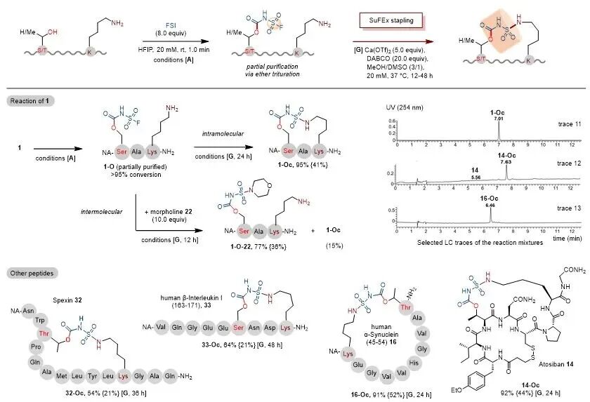 如图5所示,该团队进一步发现,在Ca²⁺/DABCO介导下,氟磺酰氨基甲酸酯基团可与邻近赖氨酸(Lys)的伯胺侧链发生分子内取代反应,由此建立了一种基于醇-胺侧链配对的多肽两步钉合新策略。
