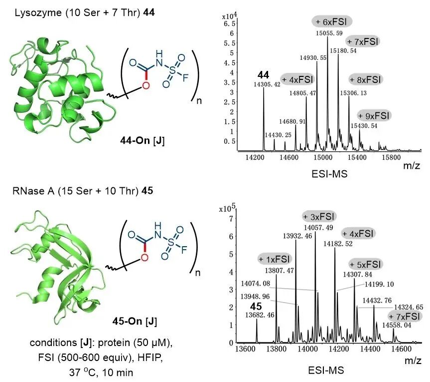如图7所示,经条件优化后,FSI介导的Ser/Thr选择性标记策略可高效应用于蛋白质修饰。以溶菌酶(44)为底物,反应生成最多携带9个氨基甲酸酯标签的偶联物44-On;胰蛋白酶酶解片段的串联质谱(MS-MS)分析证实,其17个Ser/Thr残基中16个被特异性标记,且无非目标位点修饰。圆二色谱(CD)表征显示,标记后溶菌酶的二级结构与天然酶基本保持一致。同理,核糖核酸酶A(45)经标记后得到产物45-On,最多可引入7个氨基甲酸酯标签。